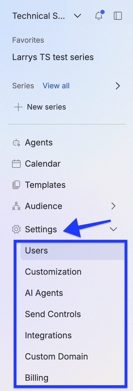 - Here you can view the Users, Customization, AI Agents, Send Controls, Integrations, Custom Domain and Billing pages.