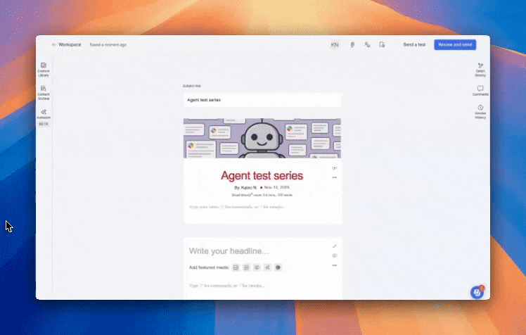 - Once you are ready to send, hit "Review and send" in the top right corner of the editor.