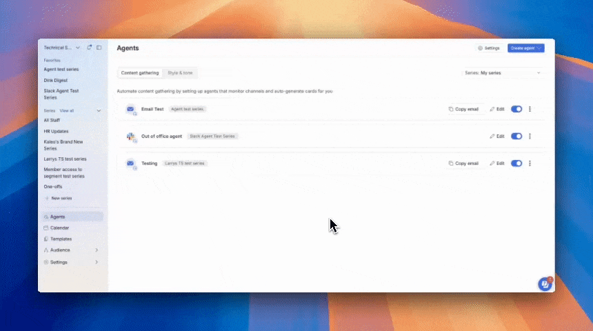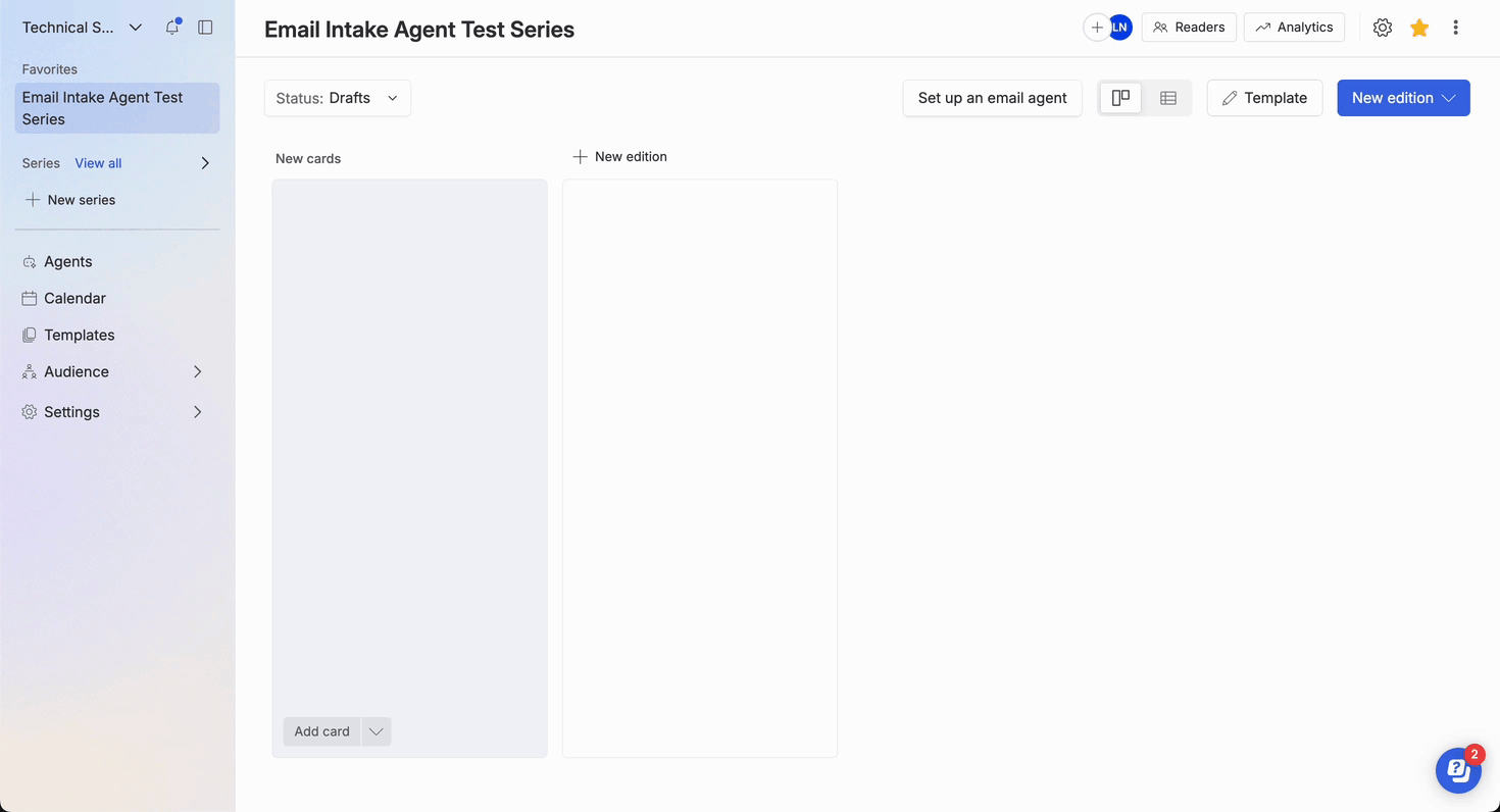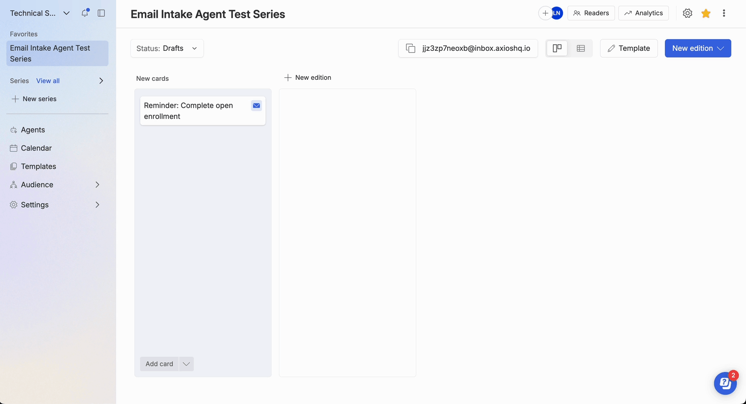 There are two ways to set up an email intake agent — depending on your workflow and preferences. Both methods link incoming emails to a specific series so ideas become actionable content cards automatically.