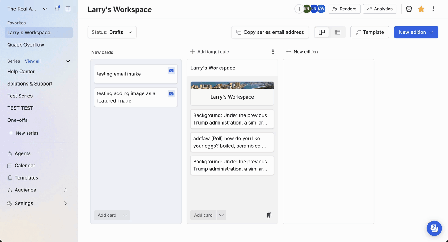 Send or forward any email to your Email Intake Agent address, and HQ will automatically convert it into a Smart Brevity formatted card in the New Cards column.