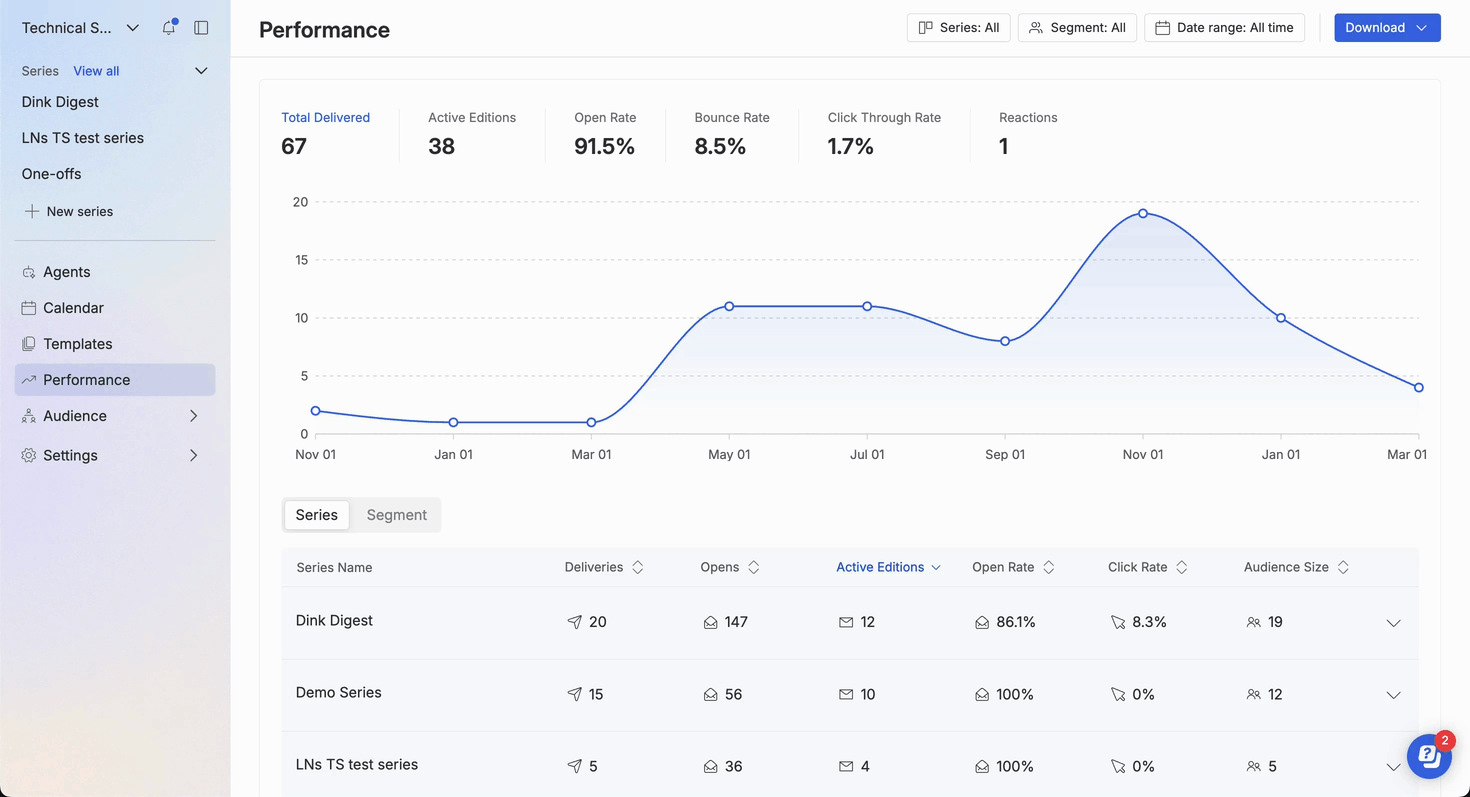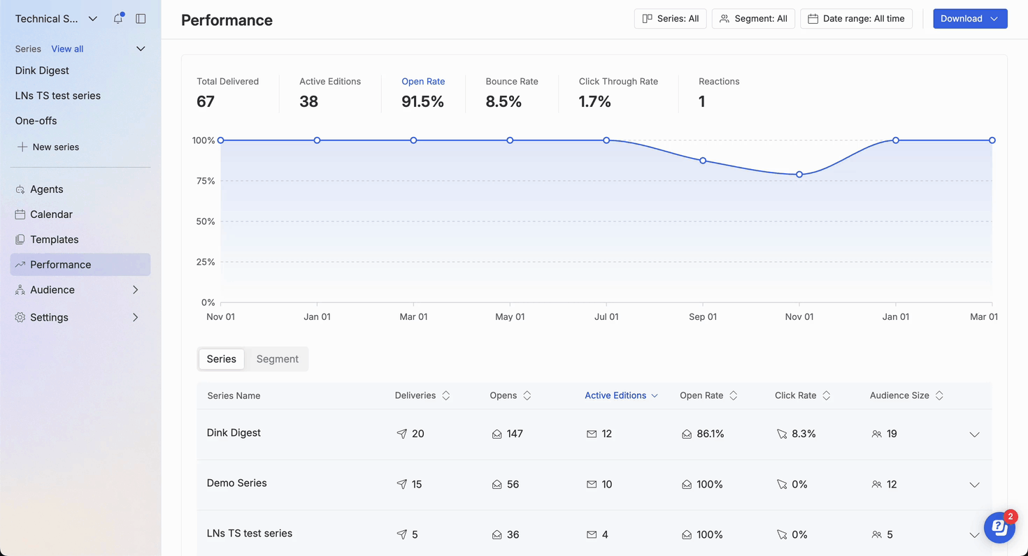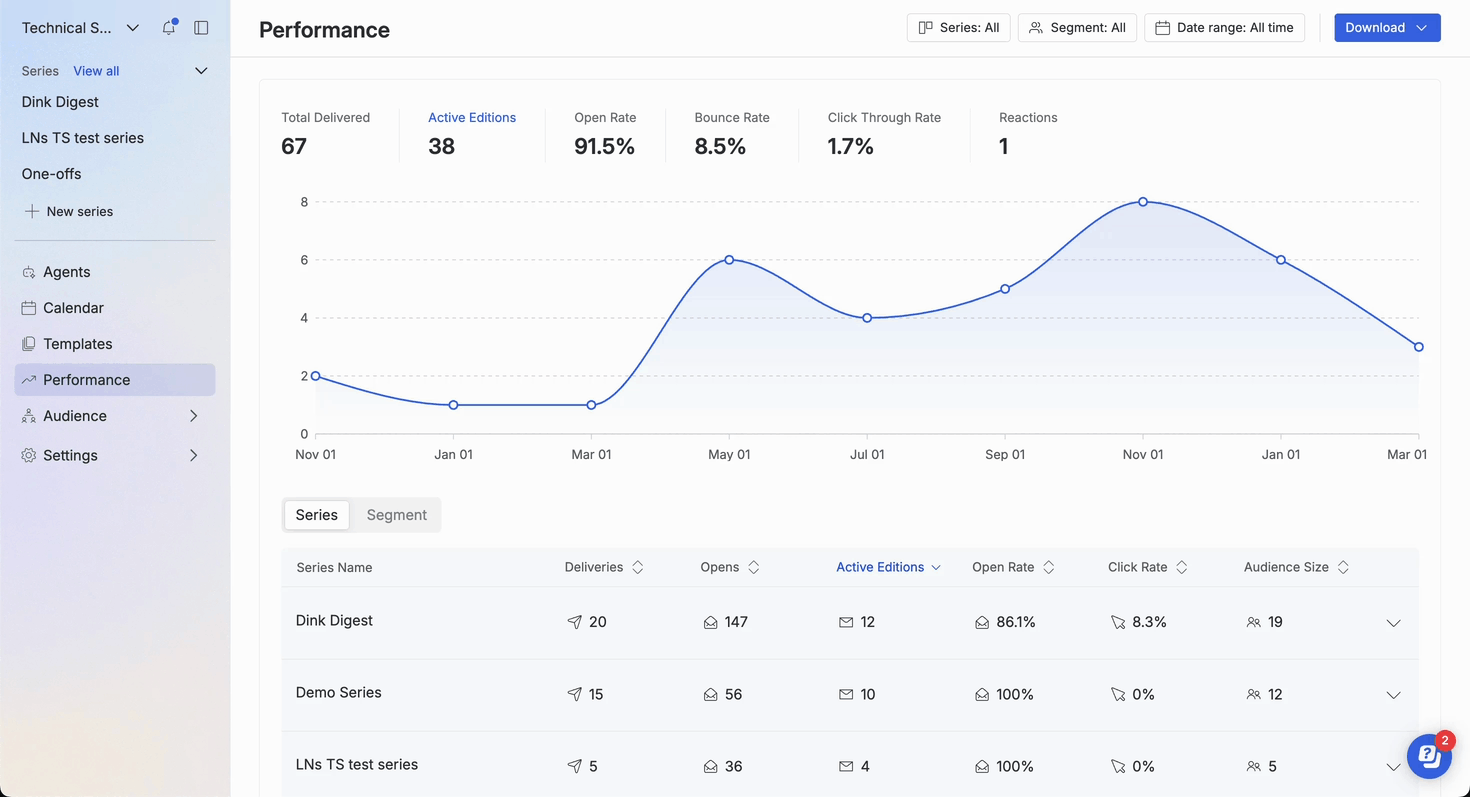The Performance page gives you a centralized view to compare how your Series and Segments are performing across your entire organization. Quickly spot engagement trends, measure results over time, and export your data — all in one place.